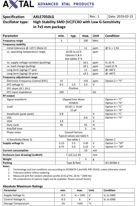 AXTAL晶振,AXLE7050LG晶振,AXLE7050LG-B-V-50-C-05-4F_Rev.1-20.000MHz晶振