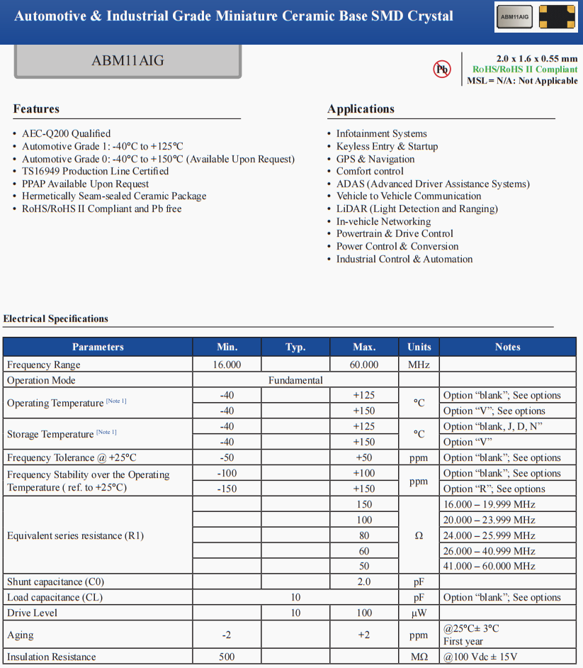 Abracon高精度晶振,ABM11AIG超小型晶振,ABM11AIG-19.200MHZ-J4Z-T3車載香薰系統晶振,美國Abracon晶振公司,艾博康晶振,ABM11AIG晶振,ABM11AIG-19.200MHZ-J4Z-T3晶振,進口晶振,無源晶振,美國晶振,高品質晶振,低損耗晶振,高精度晶振,2520晶振,四腳晶振,石英晶體,貼片晶振。適用于RoHS回流配置文件,AEC-Q200合格,汽車等級1:-40°C至+125°C,汽車等級0:-40°C至+150°C(可根據要求提供),TS16949生產線認證,PPAP可根據要求提供,密封密封陶瓷封裝,符合RoHS/RoHS II標準且不含鉛,信息娛樂系統,無鑰匙進入和啟動,GPS和導航,舒適控制,ADAS(高級駕駛輔助系統),車對車通信,激光雷達(光探測和測距),車載網絡。
