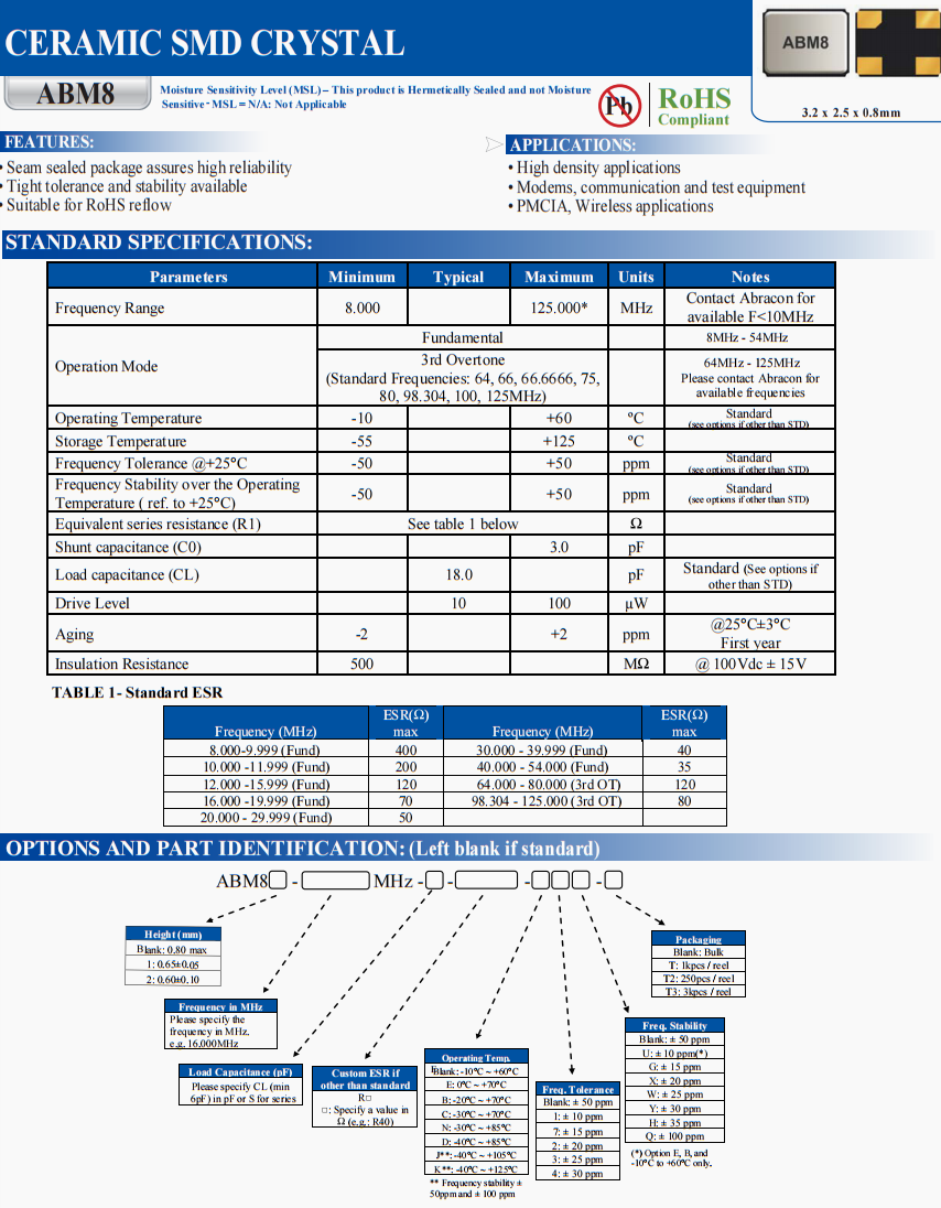 | ABM8-18.432MHZ-B2-T3 | Abracon | ABM8 | 18.432 MHz | ±50ppm | ±20ppm | 18 pF |