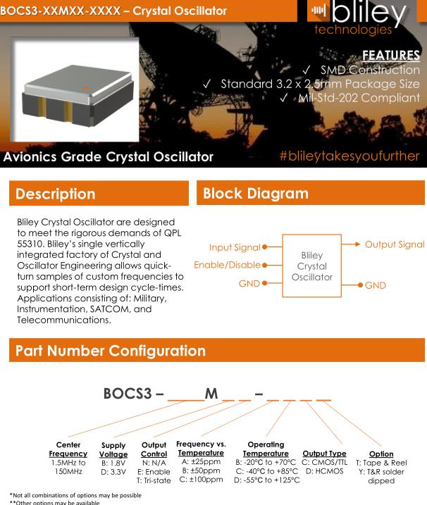 Bliley晶振,BOCS3晶振,BOCS3-24.000MBN-BCCT晶振,小型SMD有源晶振,從最初超大體積到現(xiàn)在的7050mm,6035mm,5032mm,3225mm,2520mm體積,有著翻天覆地的改變,體積的變小也使產(chǎn)品帶來(lái)了更高的穩(wěn)定性能,接縫密封石英晶體振蕩器,精度高,覆蓋頻率范圍寬的特點(diǎn),SMD高速自動(dòng)安裝和高溫回流焊設(shè)計(jì),Optionable待機(jī)輸出三態(tài)輸出功能,電源電壓范圍:1.8V~5V,高穩(wěn)定性,低抖動(dòng),低功耗,主要應(yīng)用領(lǐng)域:無(wú)線通訊,高端智能手機(jī),平板筆記本W(wǎng)LAN,藍(lán)牙,數(shù)碼相機(jī),DSL和其他IT產(chǎn)品的晶振應(yīng)用,三態(tài)功能,PC和LCDM等高端數(shù)碼領(lǐng)域,符合RoHS/無(wú)鉛.Bliley晶振公司發(fā)展歷史:
