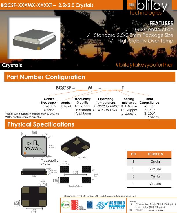 百利晶振,BQCSF晶振,BQCSF-24.000M-FDCBFT晶振,小型貼片石英晶振,外觀尺寸具有薄型表面貼片型石英晶體振蕩器,特別適用于有小型化要求的市場(chǎng)領(lǐng)域,比如智能手機(jī),無(wú)線藍(lán)牙,平板電腦等電子數(shù)碼產(chǎn)品.晶振本身超小型,薄型,重量輕,晶體具有優(yōu)良的耐環(huán)境特性,如耐熱性,耐沖擊性,在辦公自動(dòng)化,家電相關(guān)電器領(lǐng)域及Bluetooth,WirelessLAN等短距離無(wú)線通信領(lǐng)域可發(fā)揮優(yōu)良的電氣特性,滿足無(wú)鉛焊接的回流溫度曲線要求.Bliley Technologies Inc. 最初于 1930 年作為 Bliley Piezo-Electric Company 成立。最初,我們?yōu)闃I(yè)余無(wú)線電市場(chǎng)制造石英晶體。在 1930 年代中期,我們的客戶和產(chǎn)品很快擴(kuò)大到與新興的軍事和商業(yè)通信領(lǐng)域的利益相匹配,我們的名稱更名為 Bliley Electric Company。1939 年,我們是最大的水晶公司,擁有 11 名員工。