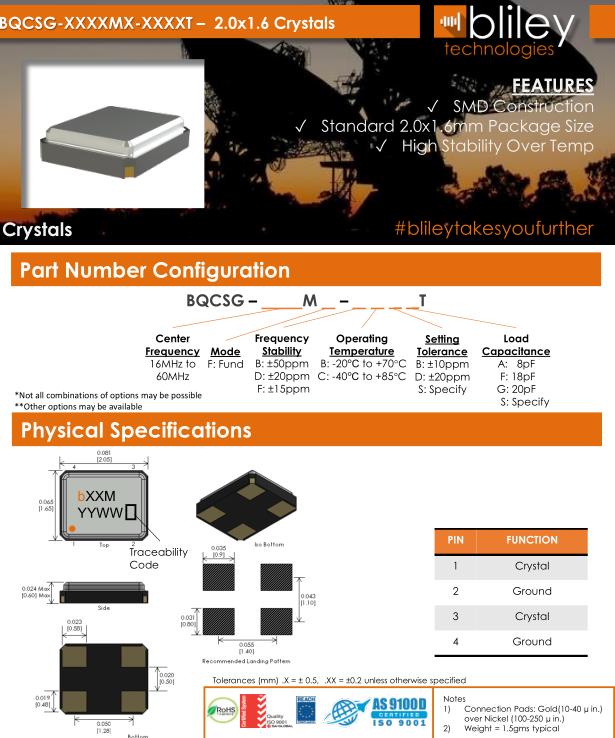 Bliley晶振,BQCSG晶振,BQCSG-16.000M-FDBBFT晶振,貼片晶振本身體積小,超薄型石英晶體振蕩器,特別適用于有目前高速發展的高端電子數碼產品,因為晶振本身小型化需求的市場領域,小型,薄型是對應陶瓷振蕩器(偏差大)和普通的石英晶體振蕩器(偏差小)的中間領域的一種性價比較出色的產品.產品廣泛用于筆記本電腦,無線電話,衛星導航SSD,USB,Blu-ray等用途,符合無鉛焊接的高溫回流焊曲線特性.Bliley晶振公司發展歷史: