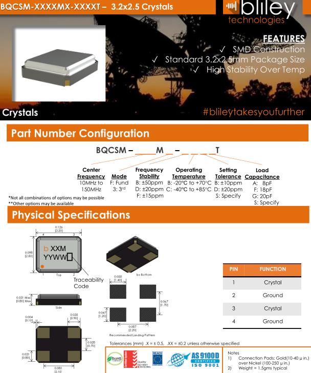 Bliley晶振,BQCSM晶振,BQCSM-20.000M-FDBBAT晶振,超小型表面貼片型SMD晶振,最適合使用在汽車電子領域中,也是特別要求高可靠性的引擎控制用CPU的時鐘部分.低頻晶振可從7.98MHz起對應,小型,超薄型具備強防焊裂性,石英晶體在極端嚴酷的環境條件下也能發揮穩定的起振特性,產品本身具有耐熱,耐振,耐撞擊等優良的耐環境特性,滿足無鉛焊接以及高溫回流溫度曲線要求,符合AEC-Q200標準.Bliley Technologies Inc. 最初于 1930 年作為 Bliley Piezo-Electric Company 成立。最初,我們為業余無線電市場制造石英晶體。在 1930 年代中期,我們的客戶和產品很快擴大到與新興的軍事和商業通信領域的利益相匹配,我們的名稱更名為 Bliley Electric Company。1939 年,我們是最大的水晶公司,擁有 11 名員工。