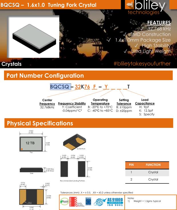 Bliley晶振,BQCSQ晶振,BQCSQ-32K76F-YBBKT晶振,貼片表晶32.768K系列具有超小型,薄型,質地輕的表面貼片音叉型石英晶體振蕩器,晶振產品本身具備優良的耐熱性,耐環境特性,在辦公自動化,家電領域,移動通信領域可發揮優良的電氣特性,符合無鉛標準,滿足無鉛焊接的回流溫度曲線要求,金屬外殼的石英晶振使得產品在封裝時能發揮比陶瓷晶振外殼更好的耐沖擊性能.Bliley Technologies Inc. 最初于 1930 年作為 Bliley Piezo-Electric Company 成立。最初,我們為業余無線電市場制造石英晶體。在 1930 年代中期,我們的客戶和產品很快擴大到與新興的軍事和商業通信領域的利益相匹配,我們的名稱更名為 Bliley Electric Company。1939 年,我們是最大的水晶公司,擁有 11 名員工。