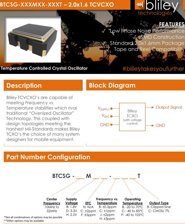 Bliley晶振,BTCSG晶振,BTCSG-16.000MDF-CBBT晶振,2016mm體積的溫補晶振(TCXO),是目前有源晶振中體積最小的一款,產品本身帶溫度補償作用的晶體振蕩器,該體積產品最適合于GPS,以及衛星通訊系統,智能電話等多用途的高穩定的頻率溫度特性晶振.為對應低電源電壓的產品.(DC+1.8V±0.1Vto+2.9V±0.1V對應IC可能)高度:最高0.8mm,體積:0.0022cm3,重量:0.008g,超小型,輕型,低消耗電流,表面貼片型產品.(可對應回流焊)無鉛產品.滿足無鉛焊接的高溫回流溫度曲線要求,帶有AFC(頻率控制)功能,Enable/Disable功能,產品本身可根據使用需要進行選擇.Bliley Technologies Inc. 最初于 1930 年作為 Bliley Piezo-Electric Company 成立。最初,我們為業余無線電市場制造石英晶體。在 1930 年代中期,我們的客戶和產品很快擴大到與新興的軍事和商業通信領域的利益相匹配,我們的名稱更名為 Bliley Electric Company。1939 年,我們是最大的水晶公司,擁有 11 名員工。