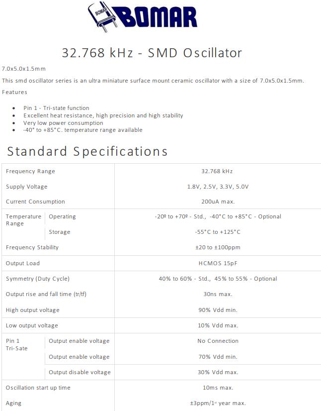 Bomar晶振,B1350-ADCS3T-32.768kHz晶振,SMD時鐘振蕩器,小型SMD有源晶振,從最初超大體積到現在的7050mm,6035mm,5032mm,3225mm,2520mm體積,有著翻天覆地的改變,體積的變小也使產品帶來了更高的穩定性能,接縫密封石英晶體振蕩器,精度高,覆蓋頻率范圍寬的特點,SMD高速自動安裝和高溫回流焊設計,Optionable待機輸出三態輸出功能,電源電壓范圍:1.8V~5V,高穩定性,低抖動,低功耗,主要應用領域:無線通訊,高端智能手機,平板筆記本WLAN,藍牙,數碼相機,DSL和其他IT產品的晶振應用,三態功能,PC和LCDM等高端數碼領域,符合RoHS/無鉛.