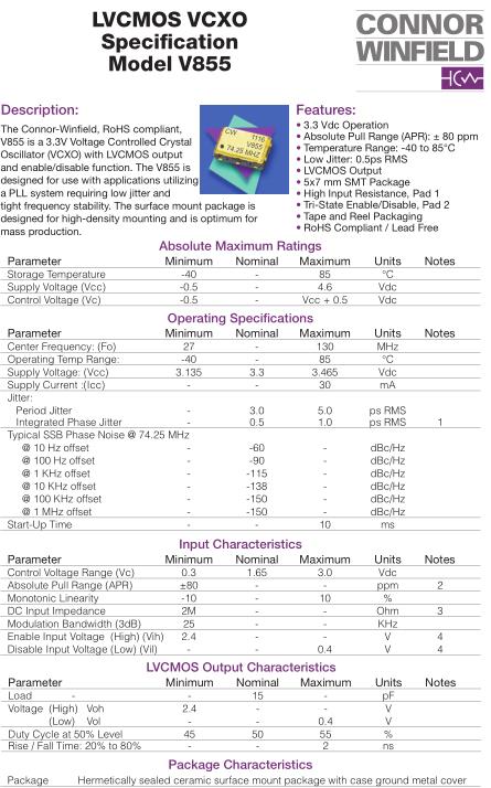 康納溫菲爾德晶振,V855晶振,V855-028.00M晶振