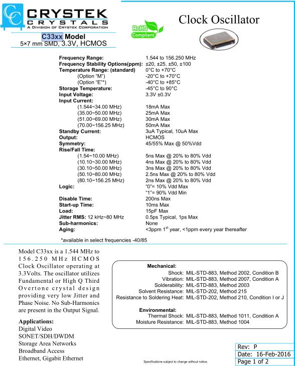 Crystek晶振,C33XX晶振,C3392-44.736MHz晶振,小型SMD有源晶振,從最初超大體積到現在的7050mm,6035mm,5032mm,3225mm,2520mm體積,有著翻天覆地的改變,體積的變小也使產品帶來了更高的穩定性能,接縫密封石英晶體振蕩器,精度高,覆蓋頻率范圍寬的特點,SMD高速自動安裝和高溫回流焊設計,Optionable待機輸出三態輸出功能,電源電壓范圍:1.8V?5V,高穩定性,低抖動,低功耗,主要應用領域:無線通訊,高端智能手機,平板筆記本WLAN,藍牙,數碼相機,DSL和其他IT產品的晶振應用,三態功能,PC和LCDM等高端數碼領域,符合RoHS/無鉛.