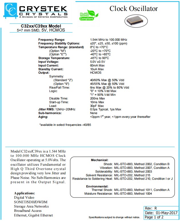 | CE3292-80.000 | Crystek晶振 | C3292 | XO (Standard) | 80MHz |
