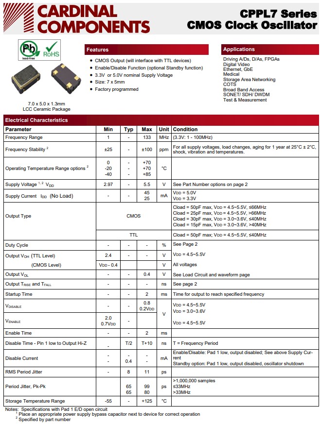 | CPPLC7LT-BR-100.0TS | Cardinal晶振 | FIPO™ CPPL | 100MHz | OSC XO 100.000MHZ CMOS SMD |