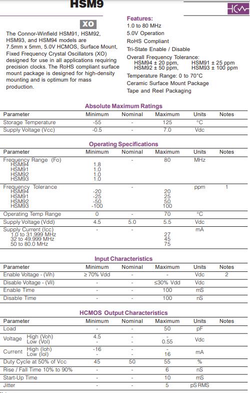 5G室內路由器專用時鐘振蕩器編碼HSM93-050.0M,康納-溫菲爾德公司利用自身的核心技術開發系列產品型號HSM91 HSM92,HSM93、HSM94型號分別為7.5mmx5mm, 5.0V,HCMOS,表面貼裝,固定頻率晶體時鐘振蕩器(XO)設計用于所有需要的應用精確的時鐘。符合RoHS標準的表面安裝包是為高密度設計的安裝和是最佳的質量生產。
