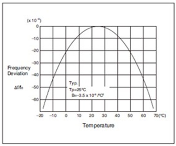 音叉晶體的頻率溫度特性的負二次曲線,其中有一個高峰期在25ºC每左圖所示.
