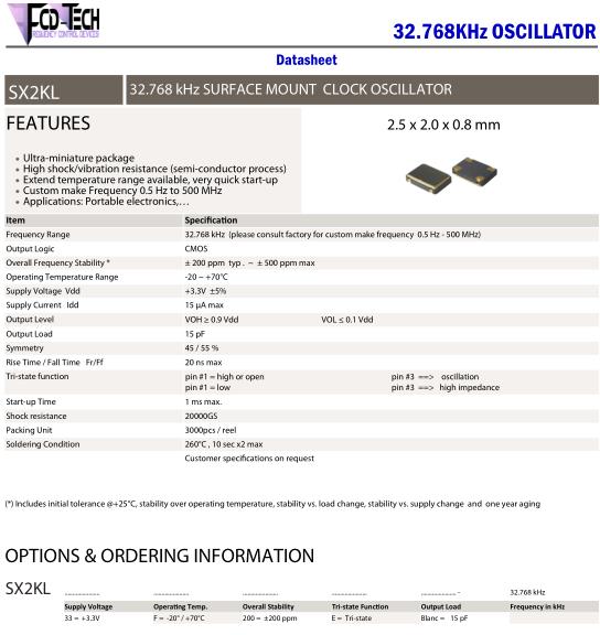 | Frequency range | 32.768 kHz (please consult factory for custom make frequency 0.5 Hz - 500 MHz) | ||