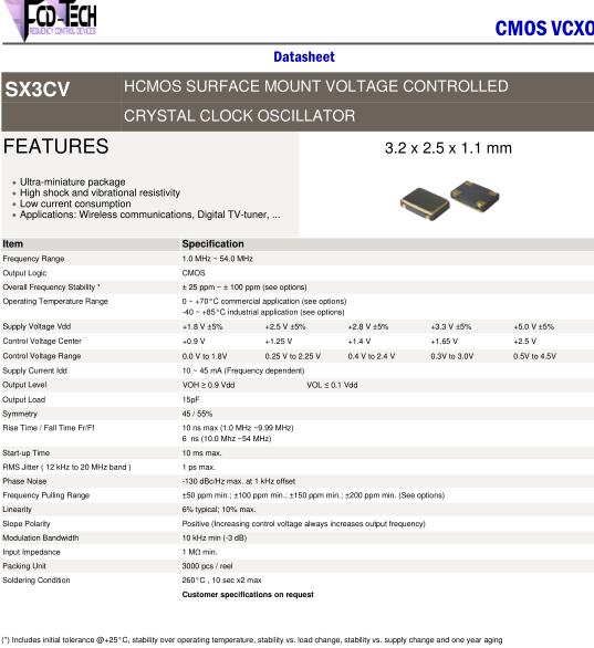 | Frequency Pulling Range | ±50 ppm min.; ±100 ppm min.; ±150 ppm min.; ±200 ppm min. (See options) | ||||