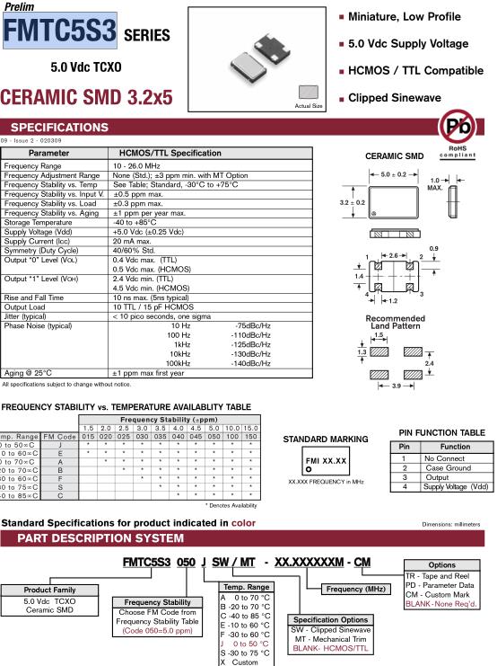 - 產品描述:FMI晶振,FMTC5S3晶振,FMTC5S3050JSW/MT-12.000M-CM晶振,溫補晶振(TCXO)產品本身具有溫度補償作用,高低溫度穩定性:頻率精度高0.5PPM-2.0PPM,工作溫度范圍:-30度至85度,電源電壓:1.8V-3.3V之間可供選擇,產品本身具有溫度...