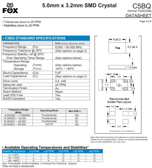 | FOX晶振規格 | 單位 | C5BQ晶振頻率范圍 | 石英晶振基本條件 | |