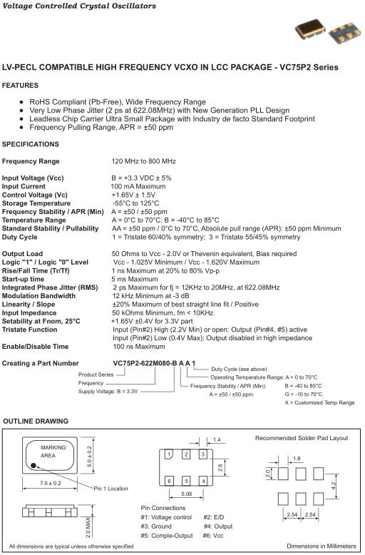 Fortiming晶振,VC75P2晶振,VC75P2-622M080-BAA1晶振,壓控晶振(VCXO),壓控石英晶體振蕩器基本解決方案,PECL輸出,輸出頻率60MHz到200MHz之間,出色的低相位噪聲和抖動,三態功能,應用:SDH/SONET,以太網,基站,筆記本晶振應用,符合RoHS/無鉛.我們致力于為您提供最好的服務,這是我們知道的最佳方式,可以贏得您的信任并建立持久的關系.收集和組織有關頻率控制和時序管理應用相關主題的最新信息,它涵蓋了型產品開發,新應用,型制造技術以及全球最新業務開發.