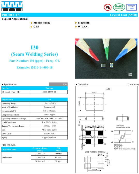 ITTI晶振,I30晶振,I3010-14.000-18晶振,超小型表面貼片型SMD晶振,最適合使用在汽車電子領域中,也是特別要求高可靠性的引擎控制用CPU的時鐘部分.低頻晶振可從7.98MHz起對應,小型,超薄型具備強防焊裂性,石英晶體在極端嚴酷的環境條件下也能發揮穩定的起振特性,產品本身具有耐熱,耐振,耐撞擊等優良的耐環境特性,滿足無鉛焊接以及高溫回流溫度曲線要求,符合AEC-Q200標準.