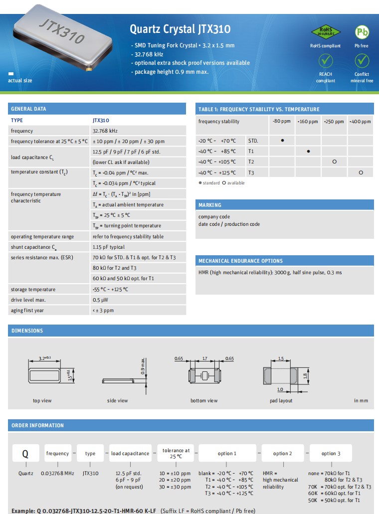 Q 0.032768-JTX310-12.5-20-T1-HMR-50K-LF Jauch晶振 JTX310 32.768kHz