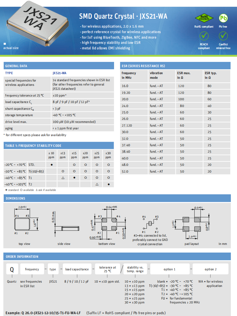 • 產(chǎn)品描述:Q38.4-JXS21-10-10/10-FU-WA-LF,JXS21-WA,Jauch超小型晶振,可穿戴設(shè)備晶振,Jauch晶振,法國進(jìn)口晶振,型號:JXS21-WA,編碼為:Q38.4-JXS21-10-10/10-FU-WA-LF,頻率:38.400MHz,頻率容差:10ppm,頻率穩(wěn)定性:10pp...