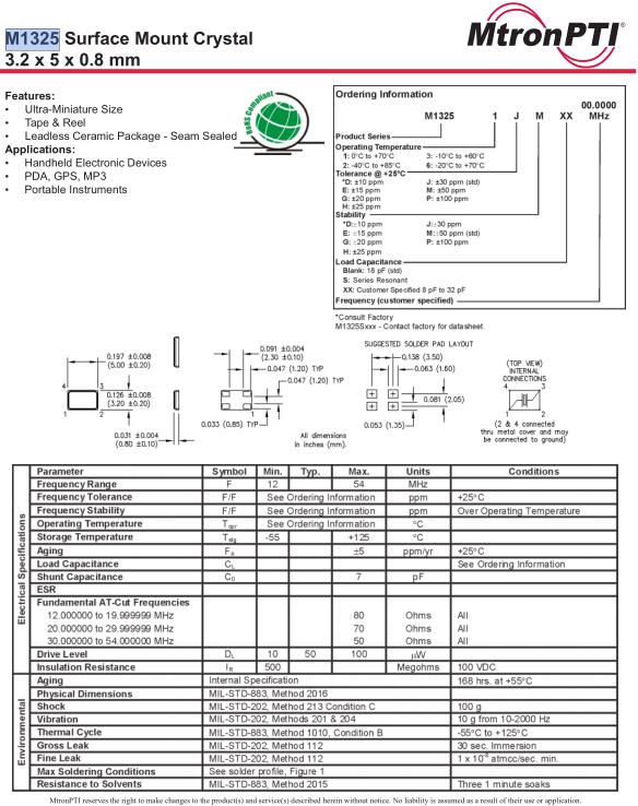 MtronPTI晶振,M1325晶振,M13251JMXX16.000000MHz晶振,小型表面貼片晶振型,是標準的石英晶體振蕩器,適用于寬溫范圍的電子數碼產品,家電電器及MP3,MP4,播放器,單片機等領域.可對應8.000MHz以上的頻率,在電子數碼產品,以及家電相關電器領域里面發揮優良的電氣特性,滿足無鉛焊接的回流溫度曲線要求.