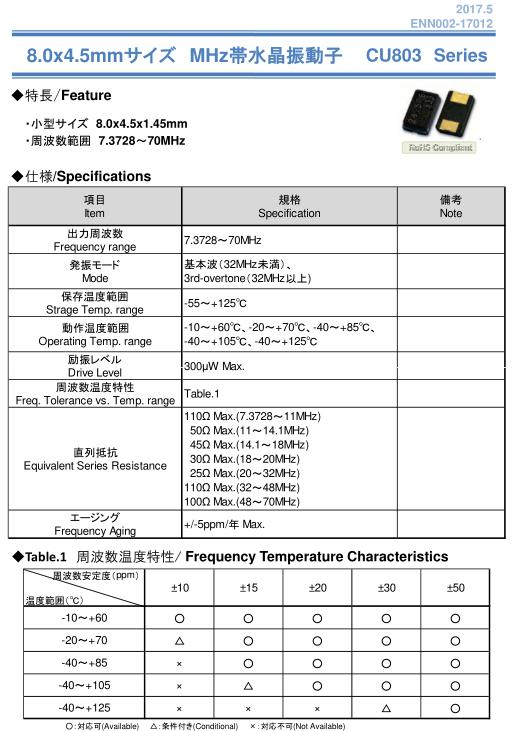 NAKA晶振,CU803晶振,水晶振動子,貼片石英晶振最適合用于車載電子領域的小型表面貼片石英晶體振蕩器.也可對應有高可靠性要求的引擎控制用CPU的時鐘部分簡稱為時鐘晶體振蕩器,在極端嚴酷的環境條件下也能發揮穩定的起振特性,產品本身具有耐熱,耐振,耐撞擊等優良的耐環境特性,滿足無鉛焊接的回流溫度曲線要求,符合AEC-Q200標準.作為一名優秀的企業公民,Naka&Co.,Ltd。的目標是成為“對地球友好的公司”,致力于環境保護并繼續開展以下活動。