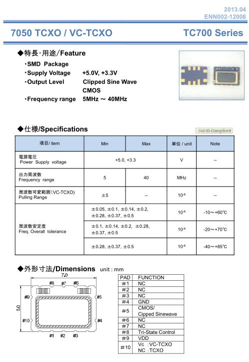 NAKA晶振,TC700晶振,溫補晶振,溫補晶振(TCXO)產(chǎn)品本身具有溫度補償作用,高低溫度穩(wěn)定性:頻率精度高0.5PPM-2.0PPM,工作溫度范圍:-30度至85度,電源電壓:1.8V-3.3V之間可供選擇,產(chǎn)品本身具有溫度電壓控制功能,世界上最薄的晶振封裝,頻率:26兆赫,33.6兆赫,38.4兆赫,40兆赫,因產(chǎn)品性能穩(wěn)定,精度高等優(yōu)勢,被廣泛應用到一些比較高端的數(shù)碼通訊產(chǎn)品領域,GPS全球定位系統(tǒng),智能手機,WiMAX和蜂窩和無線通信等產(chǎn)品,符合RoHS/無鉛.納卡晶振公司是使用模擬電路技術,擅長定制規(guī)格的水晶設備制造廠。有強烈要求“低相位噪聲、高頻、高信賴性”的通信設備、廣播設備、測量儀器、交通基礎設施、醫(yī)療器械、防衛(wèi)設備。另外,現(xiàn)在已經(jīng)成為問題了,對生產(chǎn)中止,實現(xiàn)長期性的產(chǎn)品供應,以滿足顧客未來的企業(yè)為目標。