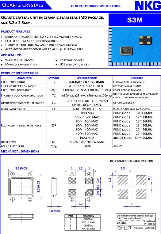 NKG晶振,S3M晶振,S3M-10.0000F-18E2-EXT晶振,超小型表面貼片型SMD晶振,最適合使用在汽車電子領域中,也是特別要求高可靠性的引擎控制用CPU的時鐘部分.低頻晶振可從7.98MHz起對應,小型,超薄型具備強防焊裂性,石英晶體在極端嚴酷的環境條件下也能發揮穩定的起振特性,產品本身具有耐熱,耐振,耐撞擊等優良的耐環境特性,滿足無鉛焊接以及高溫回流溫度曲線要求,符合AEC-Q200標準.該公司最初是作為石英晶體單元和陶瓷基產品(如陶瓷諧振器和濾波器)的貿易商。在接下來的幾年中,更多的頻率控制產品被添加到產品組合中,以提供更廣泛的產品系列。所有類型的基于石英晶體的時鐘振蕩器和VCXO,以及高端產品,如TCXO和SAW型產品,都被提供給越來越多的客戶。