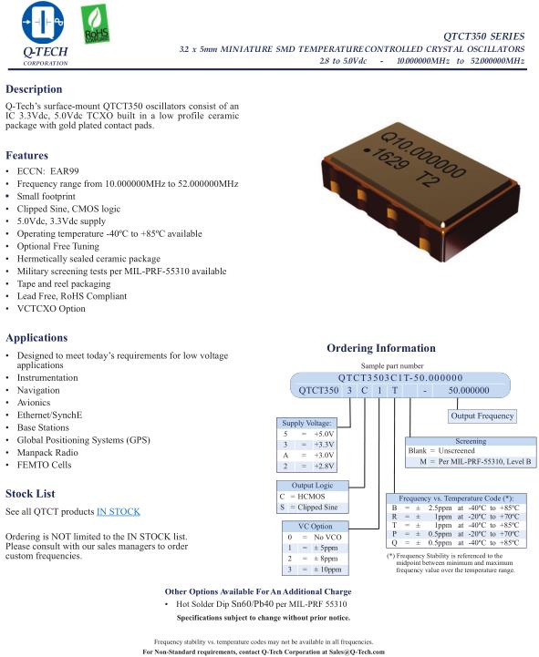 Q-Tech晶振,QTCT350晶振,QTCT3503C1T-20.000000晶振,5032mm體積的石英晶體振蕩器,有源晶振,該產品可驅動2.5V的溫補晶振,壓控晶振,VC-TCXO晶體振蕩器產品,電源電壓的低電耗型,編帶包裝方式,可對應自動高速貼片機自動焊接,及IR回流焊接(無鉛對應),為無鉛產品,超小型,質地輕.產品被廣泛應用到集成電路,程控交換系統,無線發射基站.