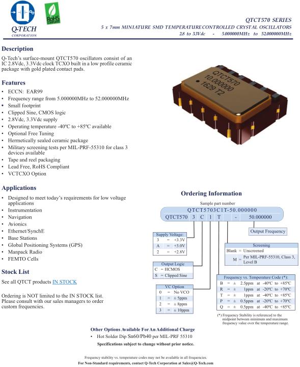 作為美國領(lǐng)先的MIL-PRF-55310合格產(chǎn)品制造商以及航空航天公司TOR(GPS III)和NASA GSFC規(guī)格等超高可靠性標(biāo)準(zhǔn),Q-Tech自豪地為軍事,航空航天,井下服務(wù),和我們的客戶合作四十年,在深空工業(yè)中取得無限成功。由Q-Tech設(shè)計和制造的零件在地殼以下數(shù)公里的范圍內(nèi),以及遠遠超出太陽系的深空任務(wù)中都表現(xiàn)出色。Q-TECH研發(fā)和生產(chǎn)的先進振蕩器主要用于高可靠性軍事,航空航天,鉆井設(shè)備和太空應(yīng)用。Q-TECH的產(chǎn)品不僅包含標(biāo)準(zhǔn)時鐘振蕩器,也有高穩(wěn)定性的恒溫晶振,TCXO振蕩器等元件.Q-Tech晶振,QTCT570晶振,QTCT5703C1T-24.000000晶振.