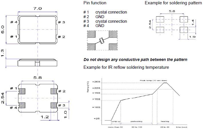 加熱包裝材料至+150°C以上會破壞產品特性或損害產品。如需在+150°C以上焊接晶體產品,建議使用SMD產品。在下列回流條件下,對晶體產品甚至SMD產品使用更高溫度,會破壞產品特性。建議使用下列配置情況的回流條件。安裝這些產品之前,應檢查焊接溫度和時間。同時,在安裝條件更改的情況下,請再次進行檢查。如果需要焊接的石英晶體產品在下列配置條件下進行焊接,請聯系我們以獲取耐熱的相關信息。