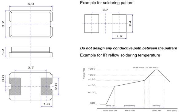 在一個不同擴張系數電路板(環氧玻璃)上焊接陶瓷封裝石英晶振時,在溫度長時間重復變化時可能導致端子焊接部分發生斷裂,請事先檢查焊接特性。QuartzCom晶振,SMX-3C晶振,兩腳貼片晶振.
