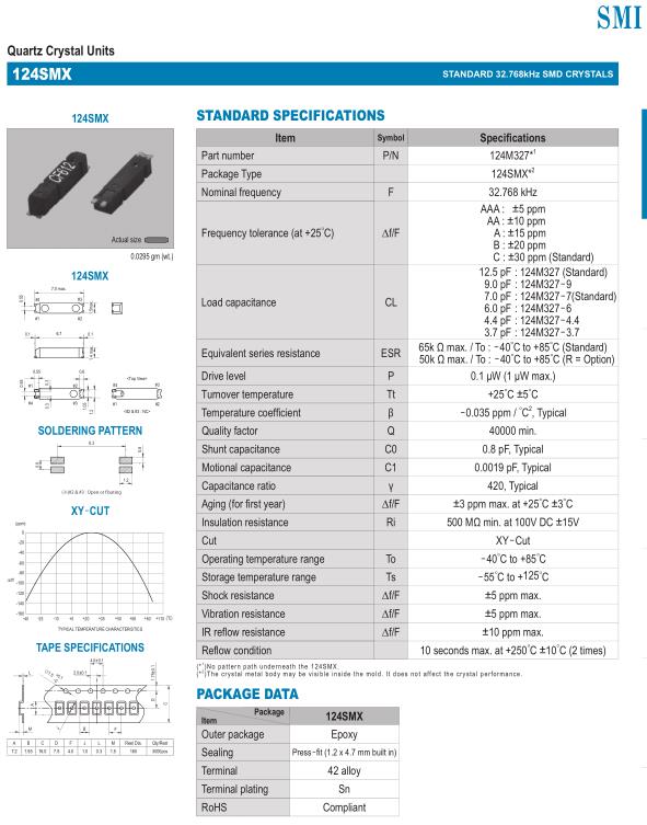 SMI晶振,124SMX晶振,7015mm無源晶振,32.768K時鐘晶體具有小型,薄型,輕型的貼片晶振表面音叉型晶體振蕩器,產(chǎn)品具有優(yōu)良的耐熱性,耐環(huán)境特性,可發(fā)揮晶振優(yōu)良的電氣特性,符合RoHS規(guī)定,滿足無鉛焊接的高溫回流溫度曲線要求,金屬外殼的封裝使得產(chǎn)品在封裝時能發(fā)揮比陶瓷振蕩器外殼更好的耐沖擊性..SMI是Crystal Technology的新興領(lǐng)導(dǎo)者。