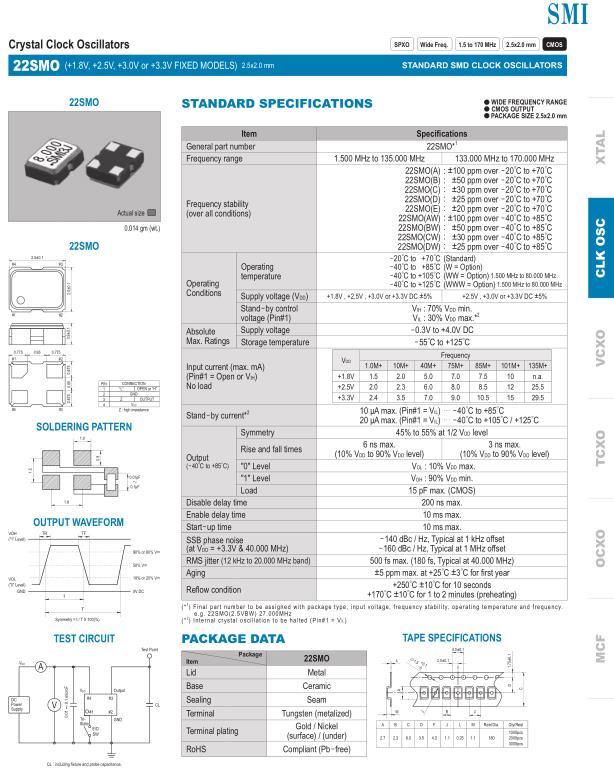 SMI晶振,22SMO晶振,OSC差分晶振,有源晶振,是指晶體本身起振需要外部電壓供應,起振后可直接驅動CMOS集成電路,產品本身已實現與薄型IC(TSSOP封裝,TVSOP封裝)同樣的1mm厚度,斷開時的消費電流是15µA以下,編帶包裝方式可對應自動搭載及IR回流焊接(無鉛對應)產品有幾種電壓供選1.8V,2.5V,3V3.3V,5V,以應對不同IC產品需要.SMI晶振公司電子社會做出貢獻,在穩步的研究和努力的基礎上,快速開發先進的水晶產品。