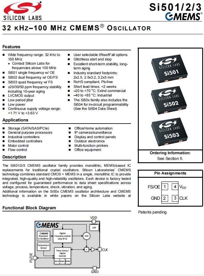 進口晶振Si501 CMEMS振蕩器系列為傳統的晶體振蕩器提供了單片的,基于mems的IC替代品。硅實驗室的CMEMS技術將標準CMOS+MEMS結合在一個單片IC集成電路中,提供集成、高質量和高可靠性的振蕩器。每個設備都經過工廠測試和配置,以保證其在電壓、工藝、溫度、沖擊、振動和老化等方面的性能。