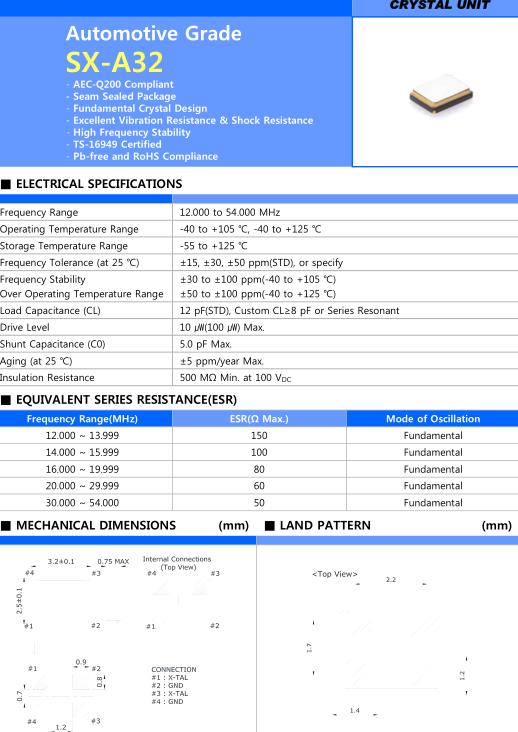 Sunny晶振,SX-A32晶振,SP10130M7–27.00000–T&R晶振,超小型表面貼片型SMD晶振,最適合使用在汽車電子領域中,也是特別要求高可靠性的引擎控制用CPU的時鐘部分.低頻晶振可從7.98MHz起對應,小型,超薄型具備強防焊裂性,石英晶體在極端嚴酷的環境條件下也能發揮穩定的起振特性,產品本身具有耐熱,耐振,耐撞擊等優良的耐環境特性,滿足無鉛焊接以及高溫回流溫度曲線要求,符合AEC-Q200標準.