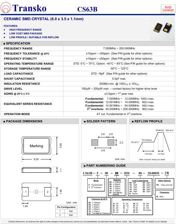 | SPECIFICATION-Transko晶振 | CS63B晶振 |