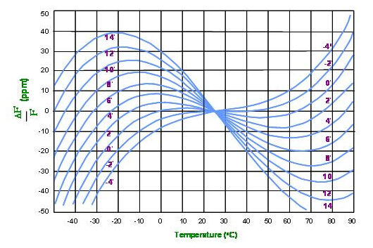 (圖)是以AT切割角度變動(dòng)在厚度振動(dòng)模態(tài)的頻率對溫度特性的展開圖. 圖中以常用的室溫?cái)z式25度作為相對零點(diǎn), AT切割的最大優(yōu)點(diǎn)是頻率對溫度變化為一元三次方曲線. 這個(gè)特性, 從(圖六)中可以看到, 在相當(dāng)寬廣的溫度范圍下, AT切割的溫度曲線的第一階及第二階常數(shù)為零, 第三階的常數(shù)便決定了頻率對溫度的變化值.