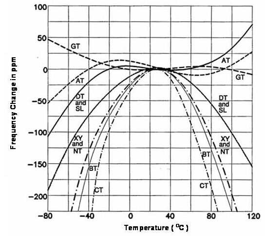 大部份的石英晶體產品是用于電子線路上的參考頻率基準或頻率控制組件, 所以, 頻率與工作環境溫度的特性是一個很重要的參數. 事實上, 良好的頻率與溫度(frequeny versus temperature)特性也是選用石英做為頻率組件的主要因素之一. 經由適當的定義及設計, 石英晶體組件可以很容易的就滿足到以百萬分之一 (parts per million, ppm) 單位等級的頻率誤差范圍. 若以離散電路方式將LCR零件組成高頻振蕩線路, 雖然也可以在小量生產規模達到所需要的參考頻率信號誤差在ppm或sub-ppm等級要求, 可是這種方式無法滿足產業要達到的量產規模. 石英組件的頻率對溫度特性更是離散振蕩線路無法簡易達成的. 在(圖) 中提供了數種不同的石英晶體切割角度的頻率對溫度特性曲線.