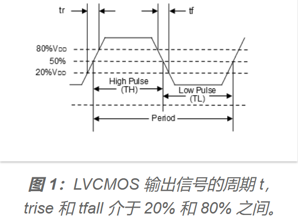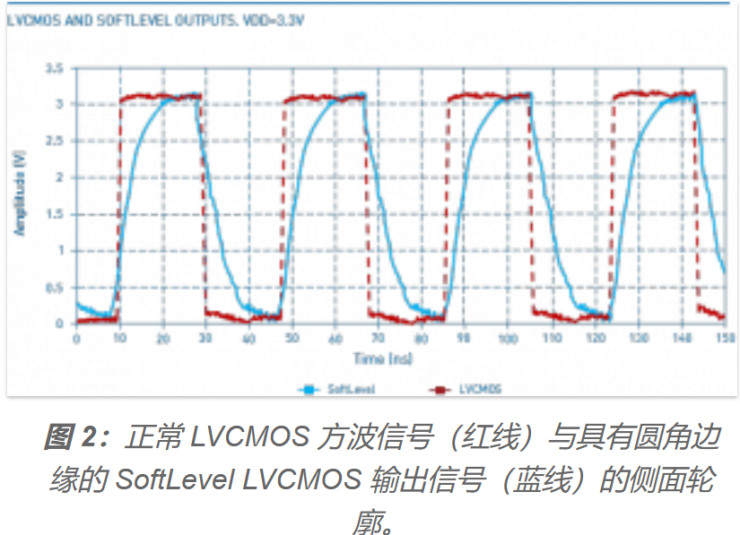 圖1顯示了上升和下降幅度在20%到80%之間的LVCMOS輸出信號的周期t。圖2顯示了在電源電壓為+3.3 VDC時,正常LVCMOS方波信號(紅線)與SoftLevel LVCMOS輸出信號(藍線)的側面輪廓。該圖表清楚地顯示了SoftLevel函數如何使方波的邊緣圓化(產生類似鯊魚鰭的形狀),從而顯著減少諧波泛音。圖3顯示了與輸出信號周期t相關的EMC - EMI衰減(奇諧波泛音)。Trise和tfall與時鐘信號的周期t成比例表示。