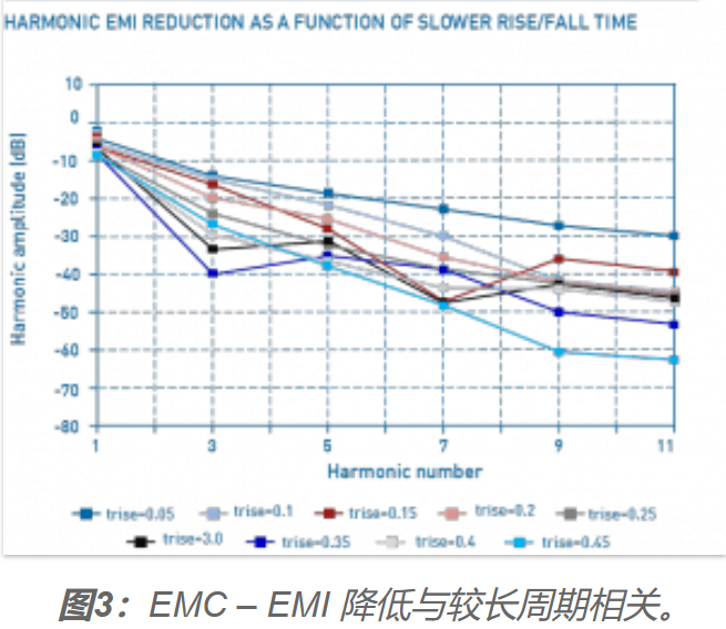trise和tfall可以在t的0.05到0.45(5%到45%)范圍內延長。如果trise和tfall與基信號相比延長5%,則信號形狀非常接近原始方波信號。當延長至45%時,輸出信號的形狀越來越像魚翅,在第11次諧波處,EMC - EMI衰減大于- 60 dB。如此簡單的升降調整價值巨大。